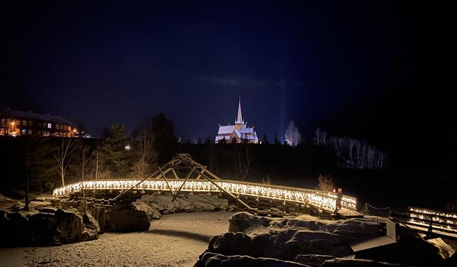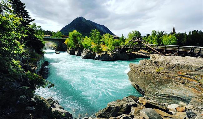 Die Bergebrua ist als eine Auslegerbrücke - des 18. Jh.s gebaut. Die Brücke wurde in Zu sammenarbeit mit der Firma "Stokk & Stein“ - und der Zimmermannsklasse der weiter führenden Schule in Lom errichtet.