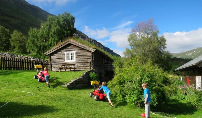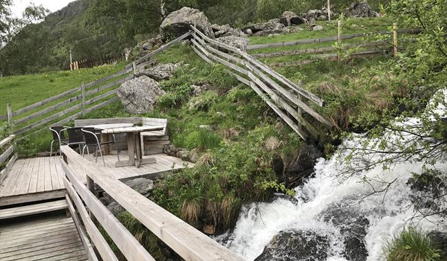 Der hübsche Hof liegt etwas außerhalb des Stadtzentrums von Lom und verfügt über einen großen Außenbereich mit angepassten Sitzmöglichkeiten im blühenden Garten. Im Bach Vittingje mit seinem fliesenden Bergwasser können Sie ein frisches Bad nehmen oder eine Mahlzeit auf der Terrasse mit Grill genießen. Vom Hof aus führt ein markierter Weg zu den Wasserfällen des Vittingje, wo Sie ein Tipi und eine Möglichkeit für Lagerfeuer finden können. Die Gastgeber können gute Tipps für Wanderungen in der Bergwelt geben und mitunter auch Folge schlagen.